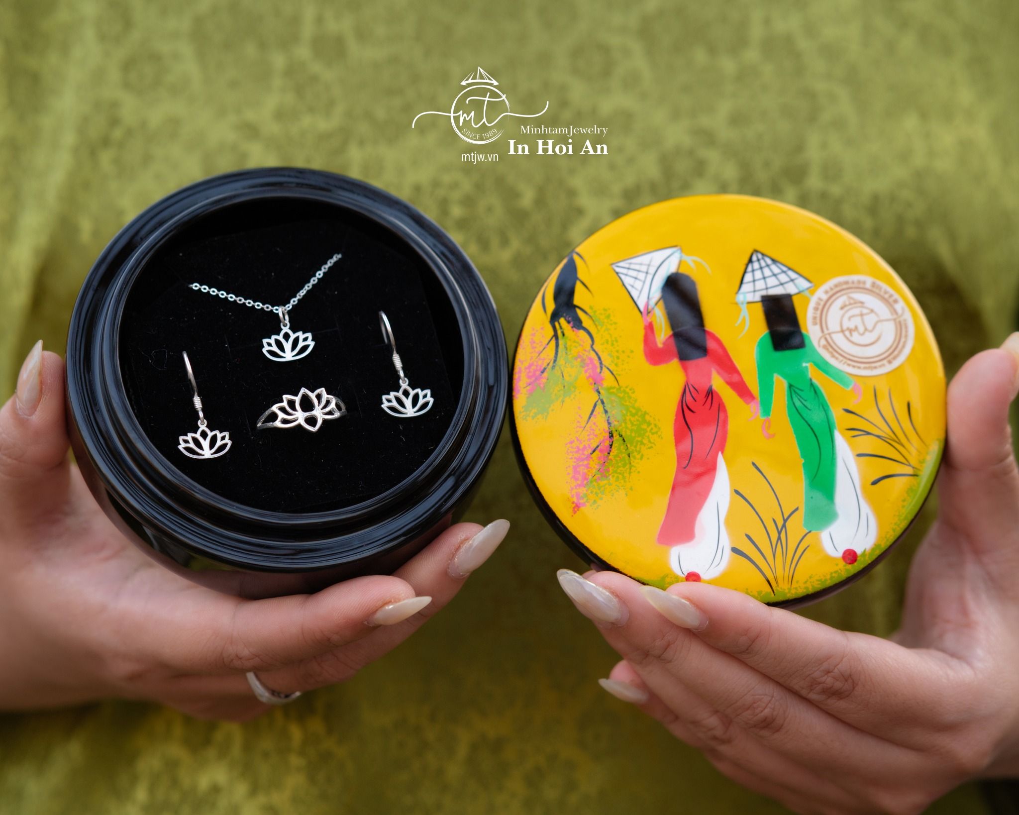 "Lotus flower silver jewelry: elegant reminder of Hoi An, Vietnam's beauty.